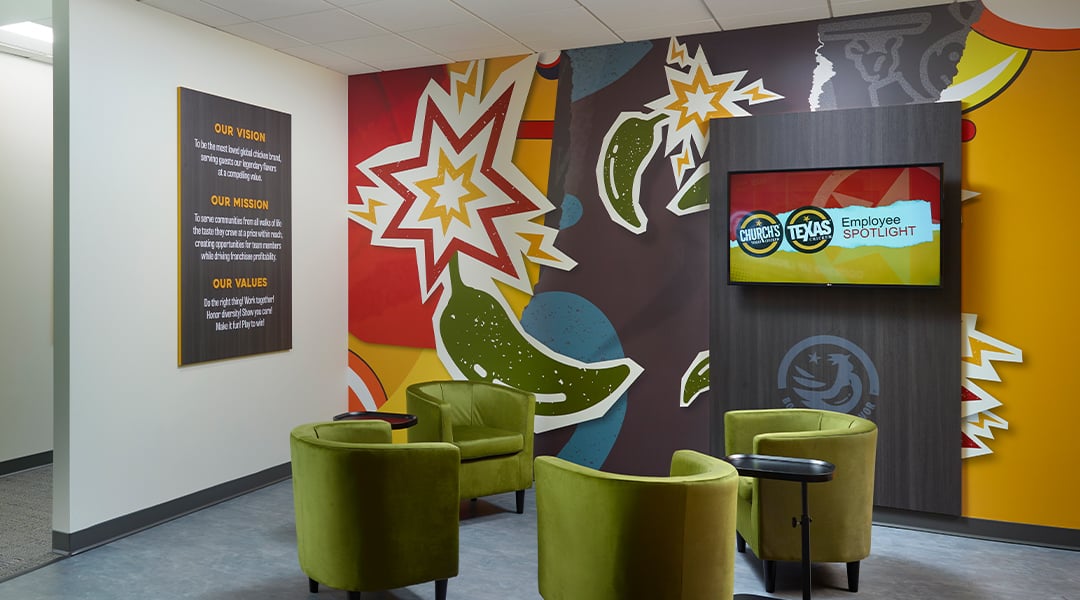 “The Church’s Texas Chicken brand has evolved over the years, and it’s currently experiencing a resurgence in growth it hasn’t experienced in years. It’s an exciting time to be with the brand, and we wanted our office space to reflect that same energy.”